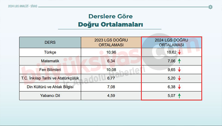 LGS sonuçlarında genel bir düşüş trendi görülüyor. Sivas İl Milli Eğitim Müdürlüğü'nün hazırladığı kendi raporlarına göre de düşüş somut olarak gözler önüne seriliyor. 2023 ve 2024 yılları arasındaki ortalamalara baktığımızda, ders bazında ciddi düşüşler dikkat çekiyor: