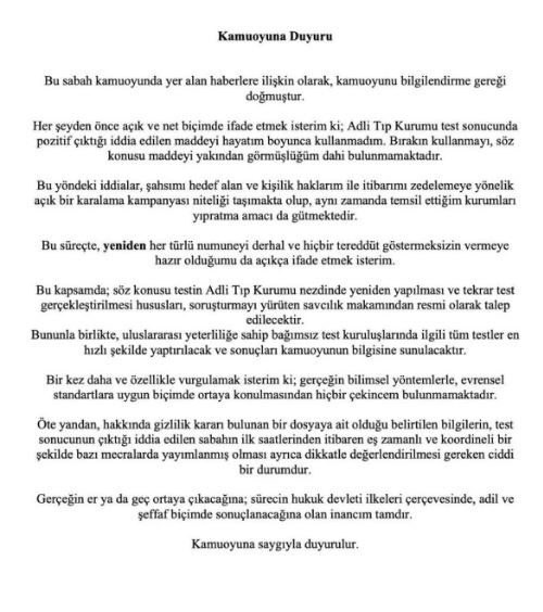 “Söz konusu maddeyi hayatım boyunca kullanmadım. Bu konuda en ufak bir tereddüdüm yoktur. Yeniden her türlü numuneyi derhal ve hiçbir tereddüt göstermeksizin vermeye hazır olduğumu da açıkça ifade etmek isterim.”