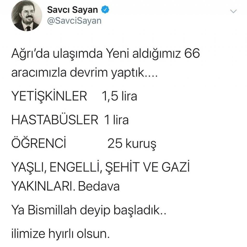 "Ağrıda otobüs ücretleri... Bizde neden sürekli zam. Hemde aktarma bile yok. Ve sivasın ulasımı cok kısa mesafeler oldugu halde cok pahalı. Acaba baslanımız Hilmi bilgin bu konuda da bir çalışma yapar mı sivas halkına"
