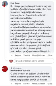 Sivas'ın eşraflarından aynı zamanda Zafer Partisi Sivas İl Başkanı olan Halil İbrahim Budaklı paylaştığı mesajında "O bina sivas ın en sağlam binalarından biridir siyaseten yapılan bu tür haberler şehre karşı yapılan büyük bir hatadır" derken