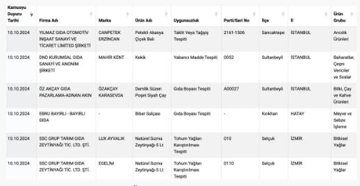 Laboratuvar sonucuyla taklit veya tağşiş yapıldığı kesinleşen gıda üreten/ithal eden firmanın adı, ürün adı, markası, parti ve/veya seri numaraları bu listede yer alıyor.