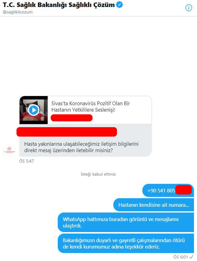 Bakanlık yetkililerinden "Hasta yakınlarına ulaşabileceğimiz iletişim bilgilerini direkt mesaj üzerinden iletebilir misiniz?" mesajı sonrası Büyük Sivas Medya Grubumuza ulaşan hastadan izin alınarak iletişim bilgisi yetkililerle paylaşıldı.