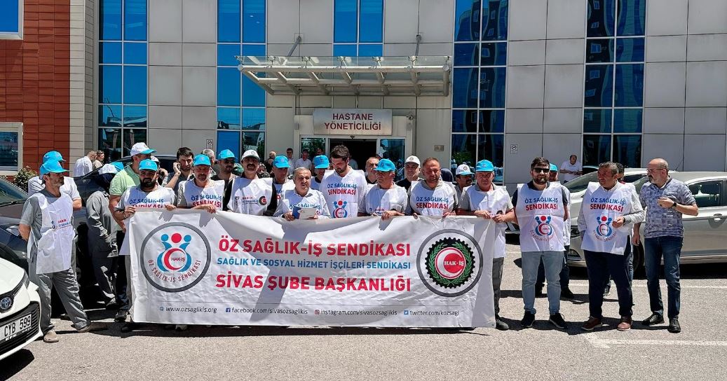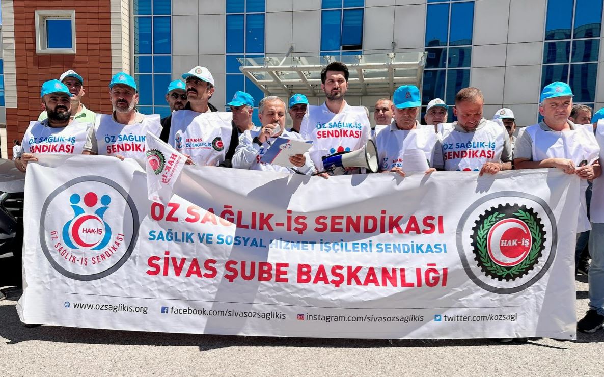 Öz Sağlık-İş Sendikası’na bağlı Sağlık ve Sosyal Hizmet İşçileri Sendikası Sivas Şube Başkanı Halil İbrahim Eyce ve sendika üyeleri, Sivas Numune hastanesi önünde devletin ocak ayından geçerli geriye dönük alacaklarının ödenmemesi nedeniyle basın açıklaması yaptı.