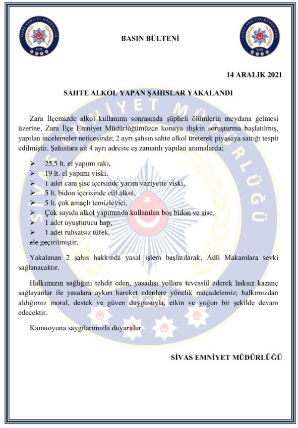Konuyla ilgili Sivas İl Emniyet Müdürlüğü açıklama yaparak sahte alkol üreten kişilerin yakalandığını belirtti.
