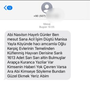 "Abi Nasılsın Hayırlı Günler Ben mesut Sana Acil İşim Düştü Manisa Yayla Köyünde hacı amcamla Oğlu Kerpiç Evlerinin Temelinden Küflenmiş Hayvan Derisine Sarılı 1613 Adet Sarı Sarı altin Bulmuşlar Arapça Kuranca Yazilar Var Kimsenin Haberi Yok Çevren Varsa Ara Abi Kimseye Söyleme Bundan Güzel Ekmek Yeriz Abim"
