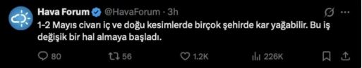 Meteoroloji kaynaklarından yapılan açıklamalarda, “1-2 Mayıs civarı iç ve doğu kesimlerde birçok şehirde kar yağabilir. Bu durum alışılmışın dışında bir tablo oluşturuyor” ifadelerine yer verildi.