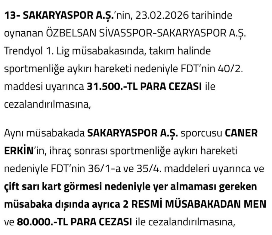 Sakaryaspor’a Sivasspor Maçı Sonrası Ceza.. Trendyol 1. Lig’de 23 Şubat 2026 tarihinde oynanan Özbelsan Sivasspor–Sakaryaspor karşılaşmasının ardından Profesyonel Futbol Disiplin Kurulu kararları açıklandı.