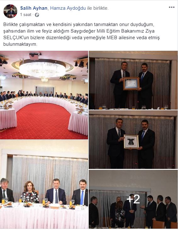 "Birlikte çalışmaktan ve kendisini yakından tanımaktan onur duyduğum, şahsından ilim ve feyiz aldığım Saygıdeğer Milli Eğitim Bakanımız Ziya SELÇUK'un bizlere düzenlediği veda yemeğiyle MEB ailesine veda etmiş bulunmaktayım." mesajı ve kendi çektiği selfie (özçekim) ile paylaştı.