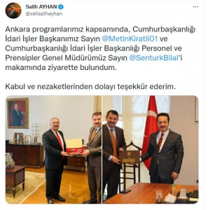 ''Ankara programlarımız kapsamında, Cumhurbaşkanlığı İdari İşler Başkanımız Sayın Metin Kıratlı ve Cumhurbaşkanlığı İdari İşler Başkanlığı Personel ve Prensipler Genel Müdürümüz Sayın Bilal Şentürk'ü makamında ziyarette bulundum. Kabul ve nezaketlerinden dolayı teşekkür ederim.''