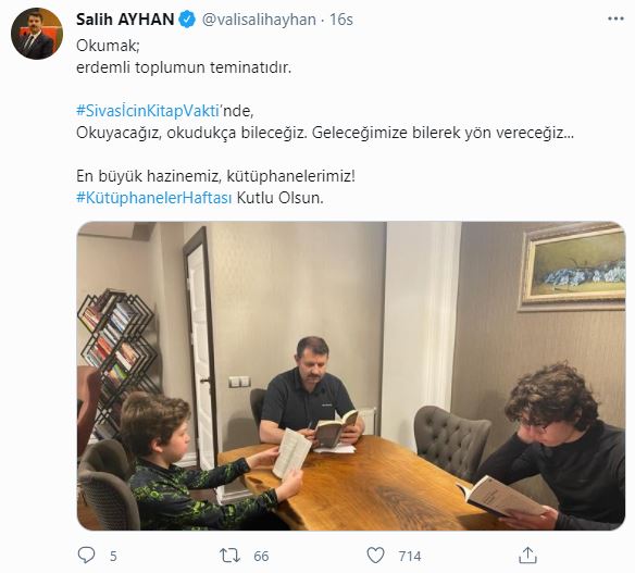 Ayhan paylaşımında "Okumak; erdemli toplumun teminatıdır. #SivasİcinKitapVakti’nde, Okuyacağız, okudukça bileceğiz. Geleceğimize bilerek yön vereceğiz... En büyük hazinemiz, kütüphanelerimiz! #KütüphanelerHaftası Kutlu Olsun." dedi.
