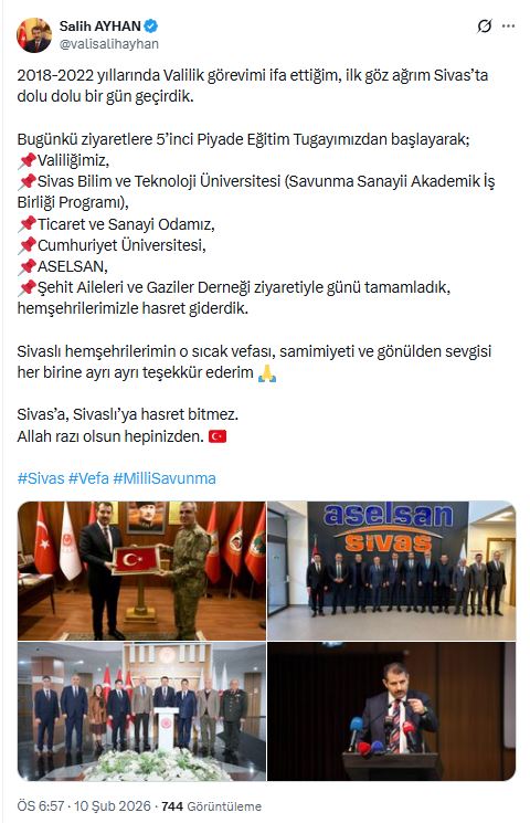 2018-2022 yılları arasında Sivas Valiliği görevini yürüttüğünü hatırlatan Ayhan, paylaşımında Sivas’ın kendisi için ayrı bir anlam taşıdığını ifade ederek şehirde dolu dolu bir gün geçirdiklerini vurguladı. Program kapsamında ilk olarak 5’inci Piyade Eğitim Tugayı’nı ziyaret eden Ayhan, daha sonra Sivas Valiliği, Sivas Bilim ve Teknoloji Üniversitesi’nde düzenlenen Savunma Sanayii Akademik İş Birliği Programı, Sivas Ticaret ve Sanayi Odası, Cumhuriyet Üniversitesi, ASELSAN ile Şehit Aileleri ve Gaziler Derneği’ni ziyaret etti.