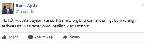 Sivas Belediye Başkanı Sami Aydın, dün facebook hesabından FETÖ hakkında açıklamada bulundu. FETÖ’nün vücuda yayılan kanserli bir hücreye benzeten ve ülkeyi sardığını belirten Başkan Aydın, ülkenin bu hastalıktan kısa sürede kurtulacağını ifade etti.