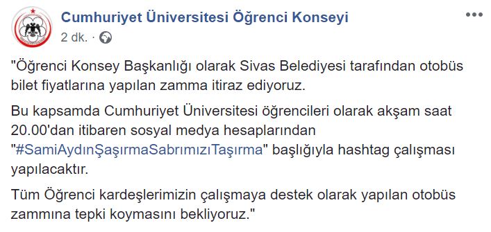 Cumhuriyet Üniversitesi öğrencileri otobüs bilet fiyatlarına yapılan zam sonrası ayağa kalktı. Öğrenciler #SamiAydınŞaşırmaSabrımızıTaşırma hashtag'ı ile seslerini tüm Türkiye'ye duyurmayı hedefliyor.