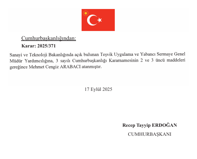 17 Eylül 2025 tarihli karar ile Arabacı, yeni görevine resmen başlamış oldu.