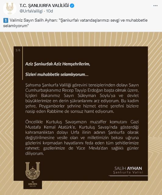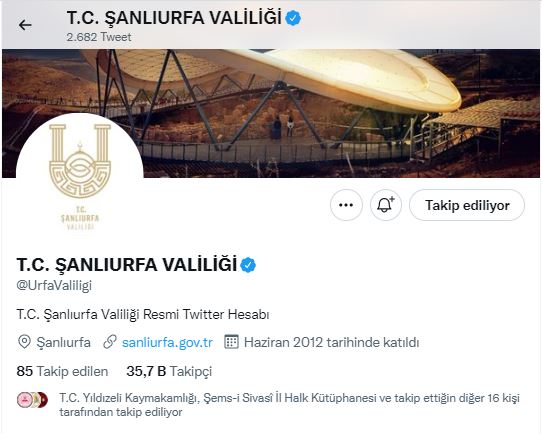 Bugün itibariyle göreve başladığı Şanlıurfa'da 35.700 takipçi ile Şanlıurfa'nın Twitter hesabının da ilk değerlendirme de derece yapmasına kesin gözle bakılıyor.