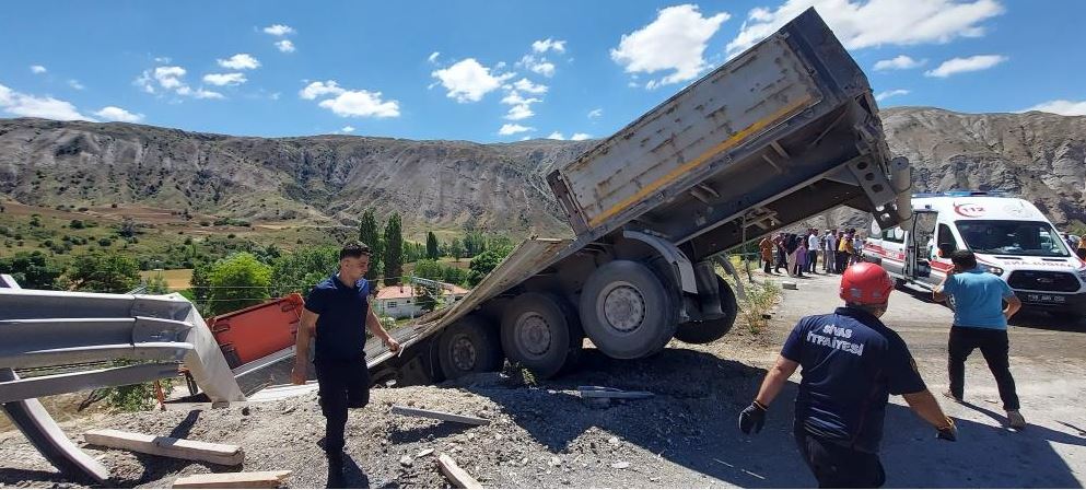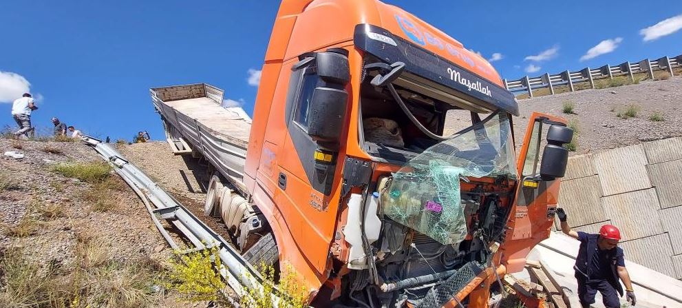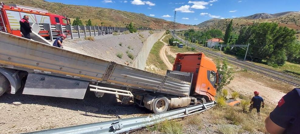 Yol kenarında ki bariyerleri aşan tır şarampolde asılı kaldı. Kazayı gören vatandaşlar itfaiye, sağlık ve jandarma ekiplerine haber verdi.