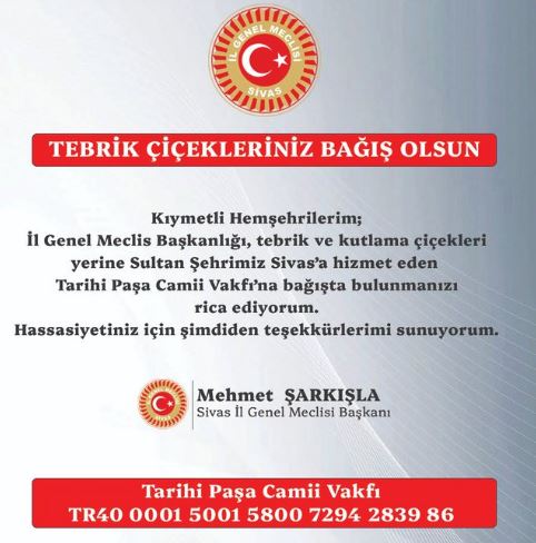 Makamına hayırlı olsun demek için çiçek istemeyen başkan Şarkışla, “Tebrik çiçekleriniz bağış olsun. Kıymetli hemşerilerim. İl Genel Meclisi Başkanlığı, tebrik ve kutlama çiçekleri yerine sultan şehrimiz Sivas’a hizmet eden Tarihi Paşa Cami Vakfı’na bağışta bulunmanıza rica ediyorum. Hassasiyetiniz için şimdiden teşekkürlerimi sunuyorum” dedi.