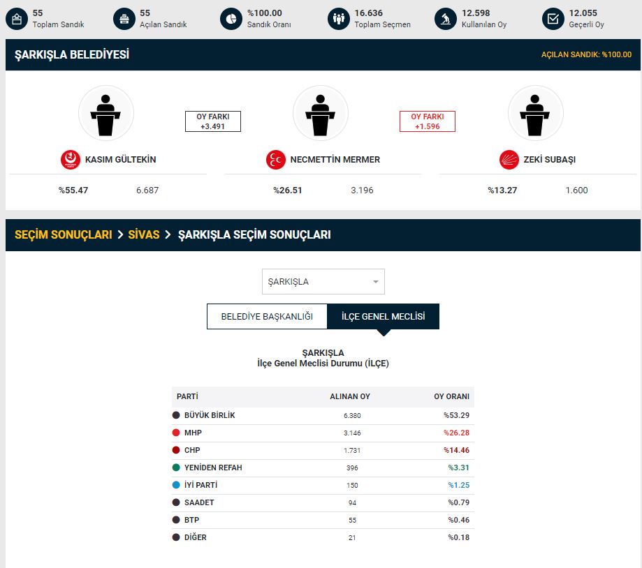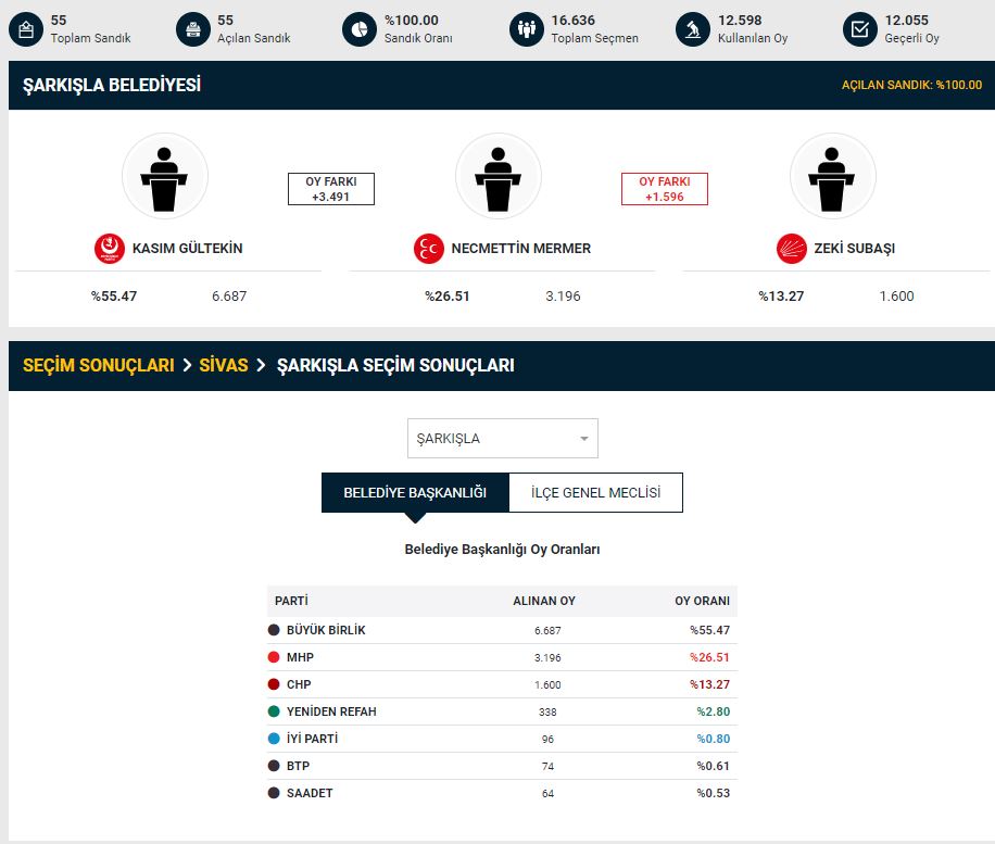 İşte 31 Mart 2024 Yerel Seçimlerinde Şarkışla İlçesinin Başkanlık seçim sonuçları..