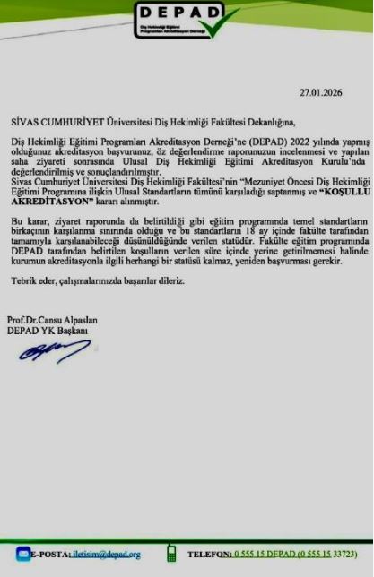 SCÜ Diş Hekimliği Fakültesi’ne DEPAD’dan Koşullu Akreditasyon.. Sivas Cumhuriyet Üniversitesi Diş Hekimliği Fakültesi, Mezuniyet Öncesi Diş Hekimliği Eğitimi Programı kapsamında yürütülen değerlendirme sürecini başarıyla tamamlayarak önemli bir kazanım elde etti.