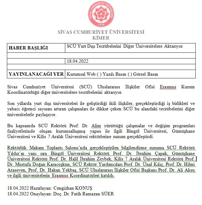 Sivas Cumhuriyet Üniversitesi (SCÜ) Uluslararası İlişkiler Ofisi Erasmus Kurum Koordinatörlüğü diğer üniversitelere tecrübelerini aktarıyor.