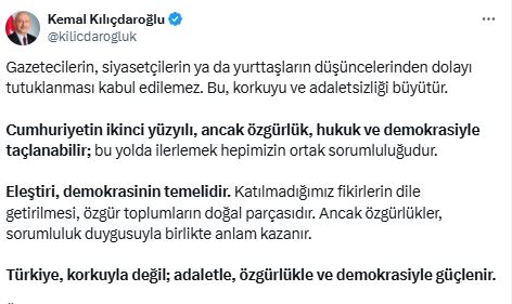 Tutuklama kararının ardından eski CHP lideri Kemal Kılıçdaroğlu, sosyal medya hesabından yayımladığı mesajda “Gazetecilerin, siyasetçilerin ya da yurttaşların düşüncelerinden dolayı tutuklanması korkuyu ve adaletsizliği büyütür. Cumhuriyetin ikinci yüzyılı ancak özgürlük, hukuk ve demokrasiyle taçlanabilir” ifadelerini kullandı. Kılıçdaroğlu, eleştirinin demokrasinin temeli olduğunu vurgulayarak Türkiye’nin “korkuyla değil adaletle” güçleneceğini söyledi.