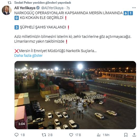 Hakkında yakalama kararı bulunan Sedat Peker, İçişleri Bakanı Ali Yerlikaya’nın Mersin Limanı'nda 610 kilogram uyuşturucu ele geçirildiğini duyurduğu paylaşımı beğenip sosyal medya hesabı X'den retweet etti.