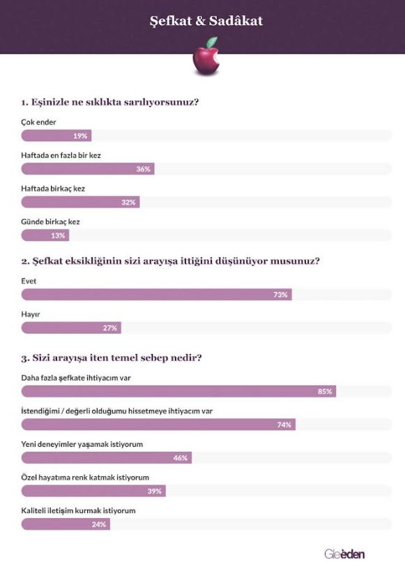“Sitemize üye olan kadınların bu araştırmayla verdiği mesaj açıktır. Şefkat, kadınlar için sadece cinsel performanslarını belirleyen bir parametre değil, eksikliğinin hissedilmesi, onları yeni arayışlara yönlendiren bir itici güç de aynı zamanda. Günlük yaşamın içinde fiziksel olarak yalnız bırakıldığını hisseden bir kadın sonunda içinde bir tık sesi duyuyor ve yenilikler aramaya başlıyor.“Gün içerisinde düzenli olarak sevgi belirtileri gösteren çiftlerin, hayâl kırıklığı yaratan durumlarda iletişim kurmaları kolaylaşıyor.