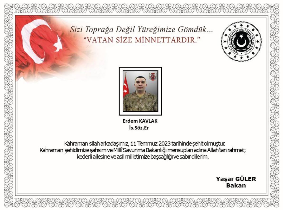MSB tarafından yapılan açıklamada, “Pençe-Kilit operasyonu bölgesinde, 11 Temmuz 2023 tarihinde, meydana gelen silah kazası sonucu ağır yaralanarak hastaneye sevk edilen kahraman silah arkadaşımız İs. Söz. Er Erdem Kavlak yapılan tüm müdahalelere rağmen kurtarılamayarak şehit olmuştur. Bizleri derin bir acı ve üzüntüye boğan bu olayda hayatını kaybeden aziz şehidimize Allah’tan rahmet, kederli ailesine, Türk Silahlı Kuvvetleri ile asil milletimize başsağlığı ve sabır dileriz” denildi.