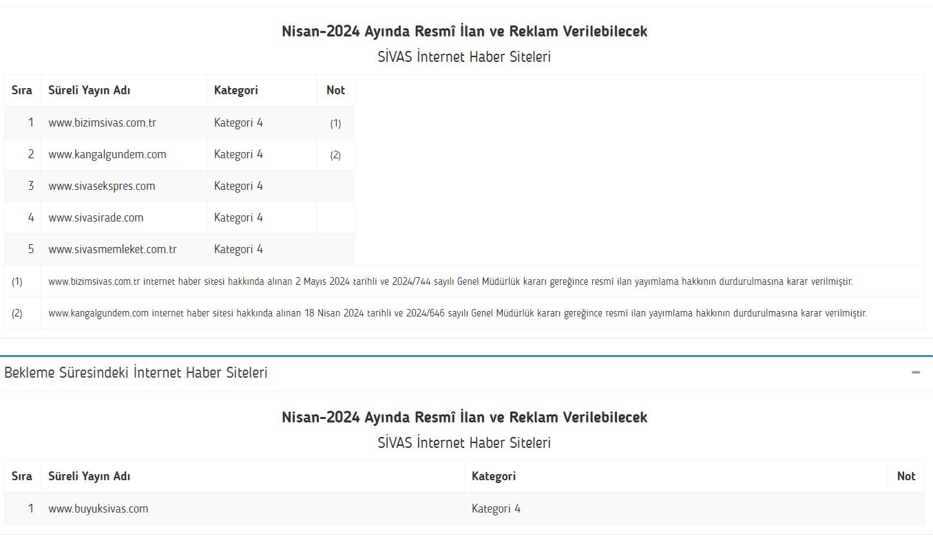 İlimiz Sivas'ta, mevcutta kağıt gazetelerde ilan yayımlama hakkı bulunduğu için bu kağıt gazetelerin internet haber siteleri olan, sivasirade.com, sivaseskpres.com, sivasmemleket.com.tr, bizimsivas.com.tr ve kangalgundem.com internet haber sitelerine bekleme süresi olmaksızın ilan yayımlama hakkı tanınmıştı.
