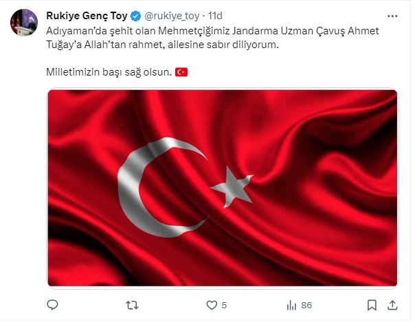 AK Parti Sivas Milletvekili Rukiye Toy sosyal medya hesabından mesaj yayınladı. Yayınladığı mesajında Toy "Adıyaman’da şehit olan Mehmetçiğimiz Jandarma Uzman Çavuş Ahmet Tuğay’a Allah’tan rahmet, ailesine sabır diliyorum. Milletimizin başı sağ olsun. 🇹🇷" ifadelerine yer verdi.
