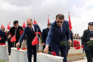 İlk olarak Polis Şehitliği’ni ziyaret eden protokol üyeleri, şehitlerin mezarlarına karanfil bıraktı. Şehitlerin mezarları başında dua eden il protokolü şehit ailelerine de baş sağlığı diledi.iha