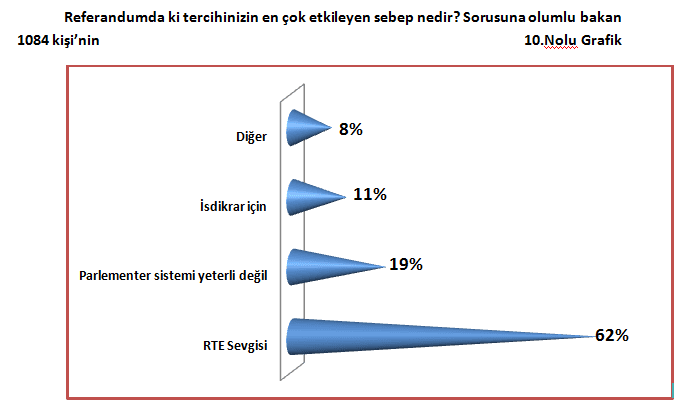 Sorduğumuz bir diğer soruda Başkanlık Sistemine evet diyeceklerin en önemli tercih sebebinin % 62 ile “Recep Tayyip Erdoğan Sevgisi” olduğu dikkatimizi çekmektedir. .(Bakınız 10 nolu grafik)