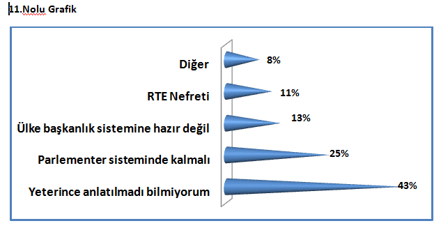 Yani Sivas halkı Parlamenter Sistemin aslında yetersiz olduğunu da düşünmemektedir. Referandumda olumsuz görüş bildirenlerin % 43’ü de konunun yeterince anlatılamadığı için olumsuz fikir beyan ettiklerini belirtmiştir. .(Bakınız 11 nolu grafik)