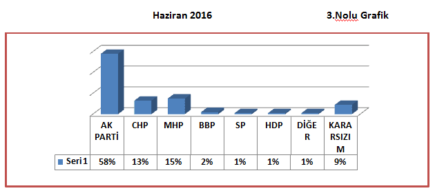 Haziran 2016’da yaptığımız araştırmada, AK Parti’ye oy veririm diyenlerin oy oranını %58’lerdeyken, Başkanlık sistemine olumlu bakanların oranının %53’lere gerilediğini görüyoruz. AK Parti oylarındaki azalmanın, Başkanlık Sistemine olumlu bakanların oranını da geriye çektiğini anlıyoruz.(Bakınız 3 ve 4 nolu grafik)