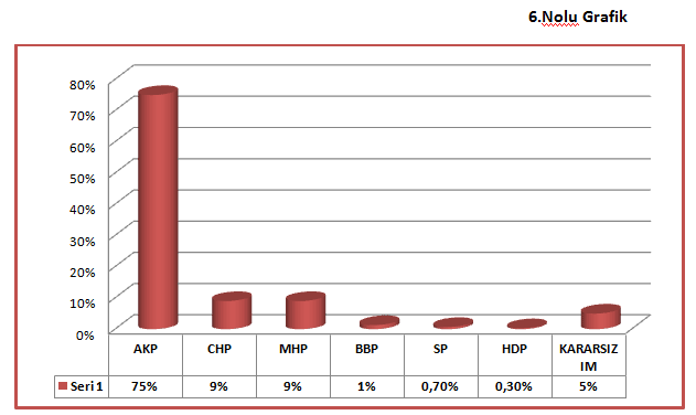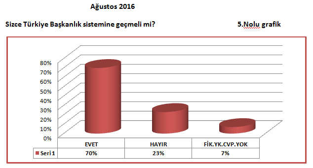 Ağustos 2016’da yaptığımız araştırmada, darbe teşebbüsünden sonra AK Parti’ye oy vereceğini söyleyenlerin oranının %75 gibi -Cumhurbaşkanlığı Referandumundaki orandan dahi daha yüksek- bir orana çıktığını görüyoruz. Bu dönemde Başkanlık Sistemi ile ilgili olumlu görüş bildirenlerin oranının da ciddi manada yükselerek %70’lere çıktığını görüyoruz. Darbe sonrası Sivas’ın Cumhurbaşkanına ve hükümete büyük bir destekle sahip çıktığını söyleyebiliriz.(Bakınız 5 ve 6 nolu grafik)