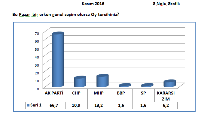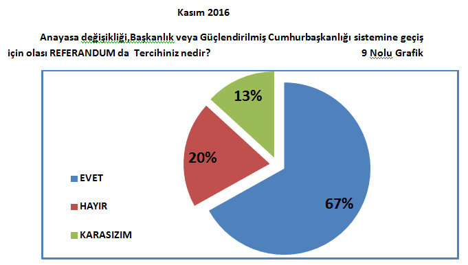 Buna karşın “Bu pazar seçim olsa AK Parti’ye oy veririm.” diyenlerin oranı %66’ ya düşmüş, olası referandumda evet diyeceklerin oranı ise %67 ye gerilemiştir. .(Bakınız 8 ve 9 grafik)