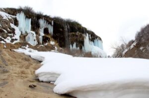 Sivas’ta Mart ayının son günlerinde dahi buz sarkıtları oluşan Dipsizgöl şelalesi, turkuaza çalan rengiyle adeta görsel şölen sunuyor.