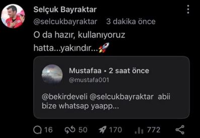 Bir vatandaşın Next Sosyal üzerinden yaptığı “WhatsApp benzeri uygulama olacak mı?” sorusuna yanıt veren Bayraktar, şu ifadeleri kullandı: