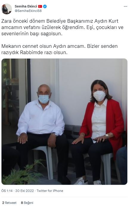 AK Parti Sivas Milletvekili Semiha Ekinci hayatını kaybeden Zara önceki dönem Belediye Başkanı Aydın Kurt ile ilgili paylaşım yaptı.