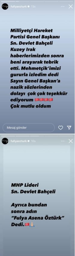 Kuzey Irak haberinden sonra Devlet Bahçeli'nin kendisini arayarak tebrik ettiğini aktaran Fulya Öztürk, Bahçeli'nin ayrıca kendisine yeni isim olarak Fulya Asena Öztürk adını önerdiğini paylaştı.