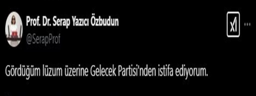 Gelecek Partisi’nin kurucuları arasında yer alan Antalya Milletvekili Prof. Dr. Serap Yazıcı Özbudun, partisinden istifa ettiğini duyurdu.