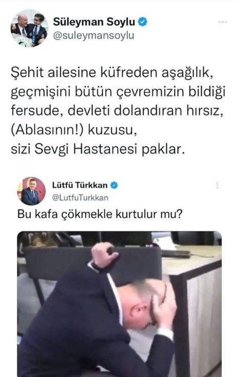 İçişleri Bakanı Süleyman Soylu, İYİ Parti Kocaeli Milletvekili Lütfü Türkkan'ın kendisine yönelik paylaşımına, "Şehit ailesine küfreden aşağılık, geçmişini bütün çevremizin bildiği fersude, devleti dolandıran hırsız, (Ablasının!) kuzusu, sizi Sevgi Hastanesi paklar" diye yanıt verdi.