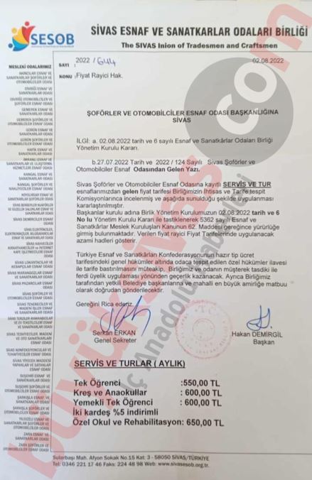 Sivas Esnaf ve Sanatkarlar Odası tarafından yapılan açıklamaya göre yeni eğitim öğretim yılında tur ve servis ücretleri şöyle: