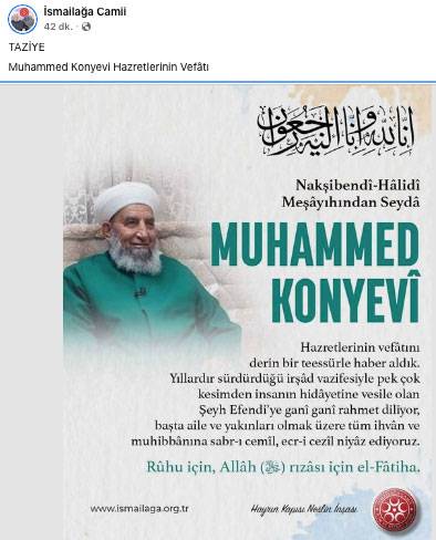 "Türkiye'nin tanınan alimlerinden ve Nakşibendi mürşidlerinden Muhammed Konyevi Hazretleri İstanbul'da tedavi gördüğü hastanede vefat etmiştir.