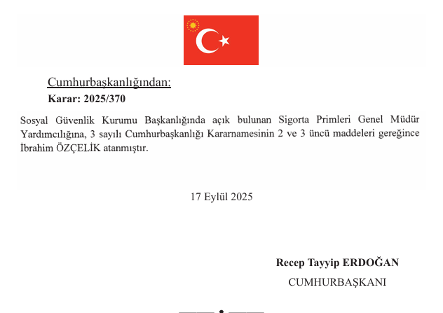 17 Eylül 2025 tarihli karar ile Özçelik, SGK’daki yeni görevine resmen başlamış oldu.
