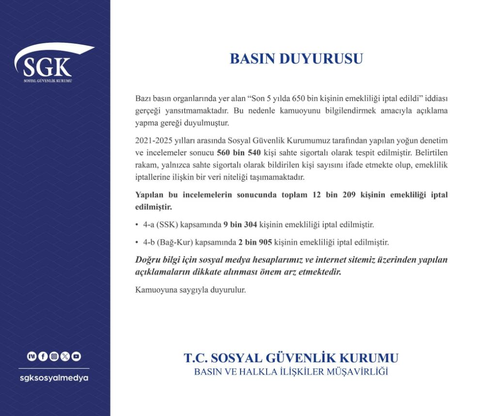 “Bazı basın organlarında yer alan ‘Son 5 yılda 650 bin kişinin emekliliği iptal edildi’ iddiası kesinlikle gerçeği yansıtmamaktadır. Yapılan denetim ve incelemeler sonucunda son 5 yılda toplam 12 bin 209 kişinin emekliliği iptal edilmiştir. Kamuoyuna saygıyla duyurulur.”