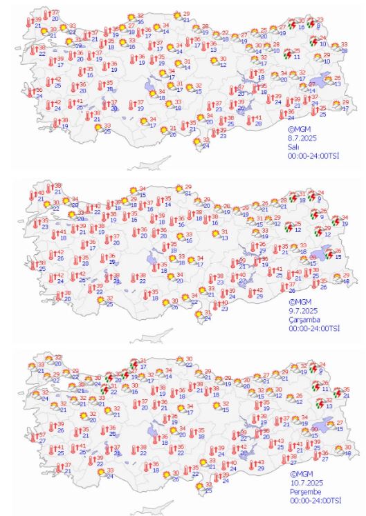 Meteoroloji Genel Müdürlüğü tarafından yapılan açıklamada, iç ve doğu kesimlerde şu anda mevsim normallerinin altında seyreden sıcaklıkların, 5 Temmuz Cumartesi gününden itibaren batı bölgelerden başlayarak artacağı ve ülke genelinde normallerin 4 ila 6 derece üzerine çıkacağı belirtildi. Bu sıcaklıkların 12 Temmuz’a kadar etkili olacağı tahmin ediliyor.