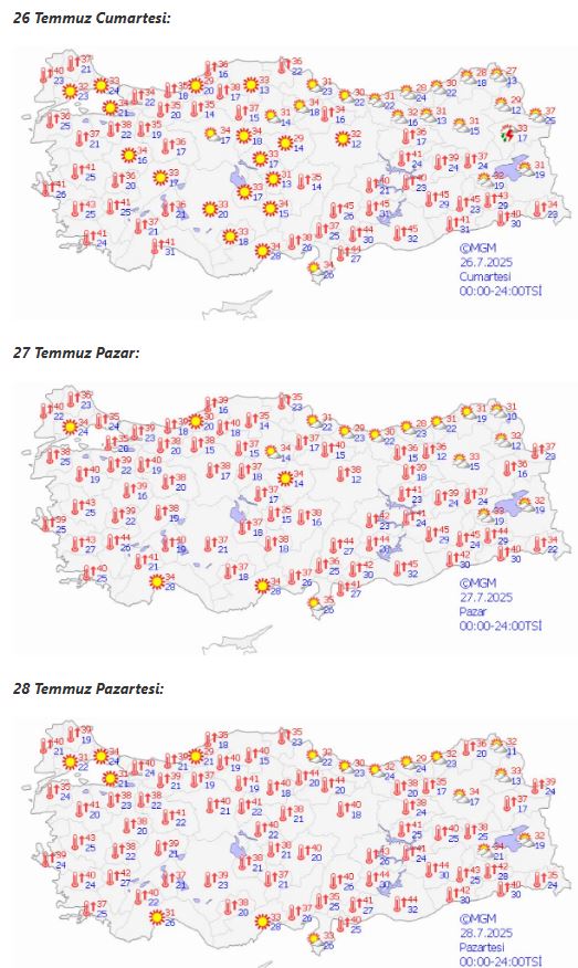 Meteoroloji Genel Müdürlüğü (MGM), 26 Temmuz-2 Ağustos tarihleri arasında Türkiye genelini etkisi altına alacak yeni bir sıcak hava dalgasına karşı vatandaşları uyardı.