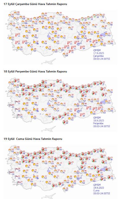 Perşembe gününden itibaren hissedilir derecede düşecek sıcaklıklarla birlikte cuma günü yağışların kuzey ve doğu bölgelerinde etkili olacağı aktarıldı. Cumartesi gününden itibaren yağışların etkisini azaltacağı, sıcaklıkların ise mevsim normallerine döneceği kaydedildi.