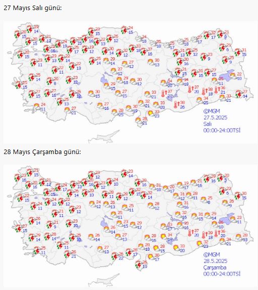 Meteoroloji Genel Müdürlüğü’nün 24-28 Mayıs 2025 tarihlerini kapsayan 5 günlük hava tahmin raporuna göre, Türkiye genelinde sıcaklıklar düşüyor, yerel yağışlar ise etkisini artırıyor.